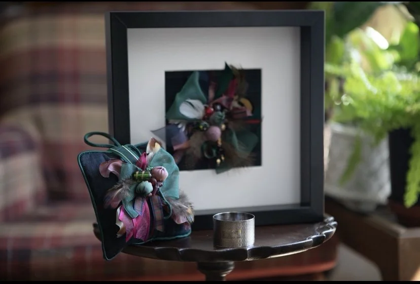 Each piece is a miniature artwork, handcrafted using vintage trimmings, silk ribbons, feathers and beads.